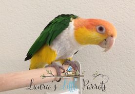 The White Bellied Caique (Pionites leucogaster) and the Black Headed Caique (Pionites melanocephalais) and the Lime Green Thigh (more rare) are known as the clowns of the parrot world. Not only from their bold colors, but from their funny personality. They are relatively quiet as far as no squawking, but can still make high pitched calls, learn various whistles, and mimic other noises as well. The White Bellied Caique originates in South America. They weigh about 150-170 grams are about 9- 10 inches in length. Their diet in the wild consists of fruits and seeds. Caiques also have an oil preening gland to clean their feathers, so those with allergies may consider one of these guys. Their average lifespan is about 30 years. All our babies are banded with a custom stainless steel band for identification.