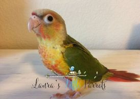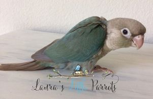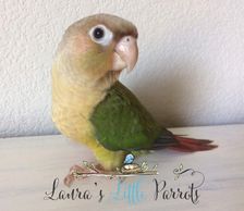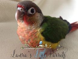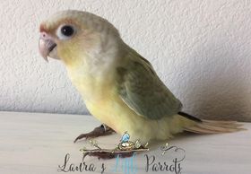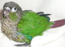 Green cheek conures (Pyrrhura molinae) are very social and intelligent birds. They originate from Brazil, Bolivia and Argentina.They are about 10 inches from head to tail and have personality of a larger species of parrot or conure. The Green Cheek is the quietest and smaller of the species of conures. They will lay on their backs to play, use their feet to eat and play, love to cuddle, and some will sleep in hanging tents (do not use plush/artificial fiber-made tents), hair, lap or wherever they feel secure. Some Green Cheek Conures even learn to talk about twenty words or so. Also they are able to learn tricks if taught such as waving, can even come when called, roll over and even play dead. Since these little ones use an oil gland to clean themselves, they may be suited for mthose that suffer from allergies. There are also many mutations including Yellowsided, Cinnamon, Pineapple (Cinnamon & Yellowsided), American Dilute, Turquoise, and Misty or Olive. Their lifespan is 20+ years.