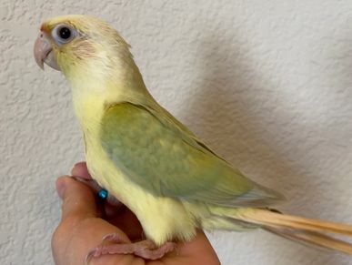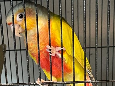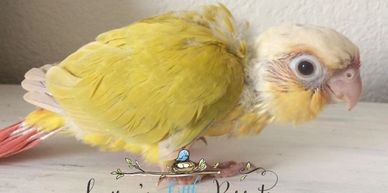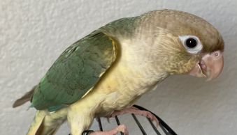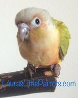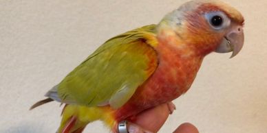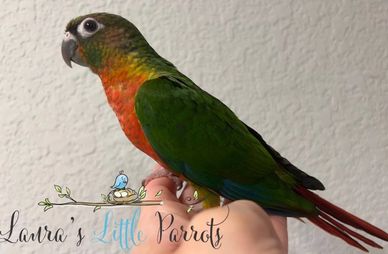 Our Green Cheek Conures go through training and have beginning training to learn to "Step-Up", giving kisses and recall. This varies on each bird and how quick they learn. Usually "Step-Up" is my priority before learning other tricks, so we at least introduce it and must continue to train when going to a new home for perfection. Each baby will have their wings clipped for easier training when arriving at their new homes. This helps keep them out of places they should not be. The early stages before weaning is the best time to socialize and handle the babies, and they get one-on-one attention daily to ensure the best possible new companion. At 8 to 10 weeks old they go to their new homes.