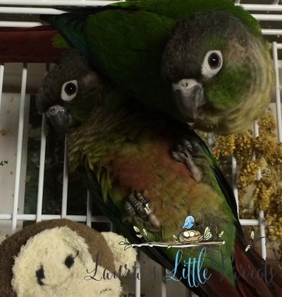 If you would like to place a deposit for any of our Green Cheek Conures, please contact us! Will send an invoice through PayPal that will have total but $100 (less than $500) to $200 ($550 and up) is required to reserve. PayPal account is not required to pay. Also checks, Zelle, and Venmo are accepted for deposits. First deposit gets first selection, etc. Deposits are non-refundable.
